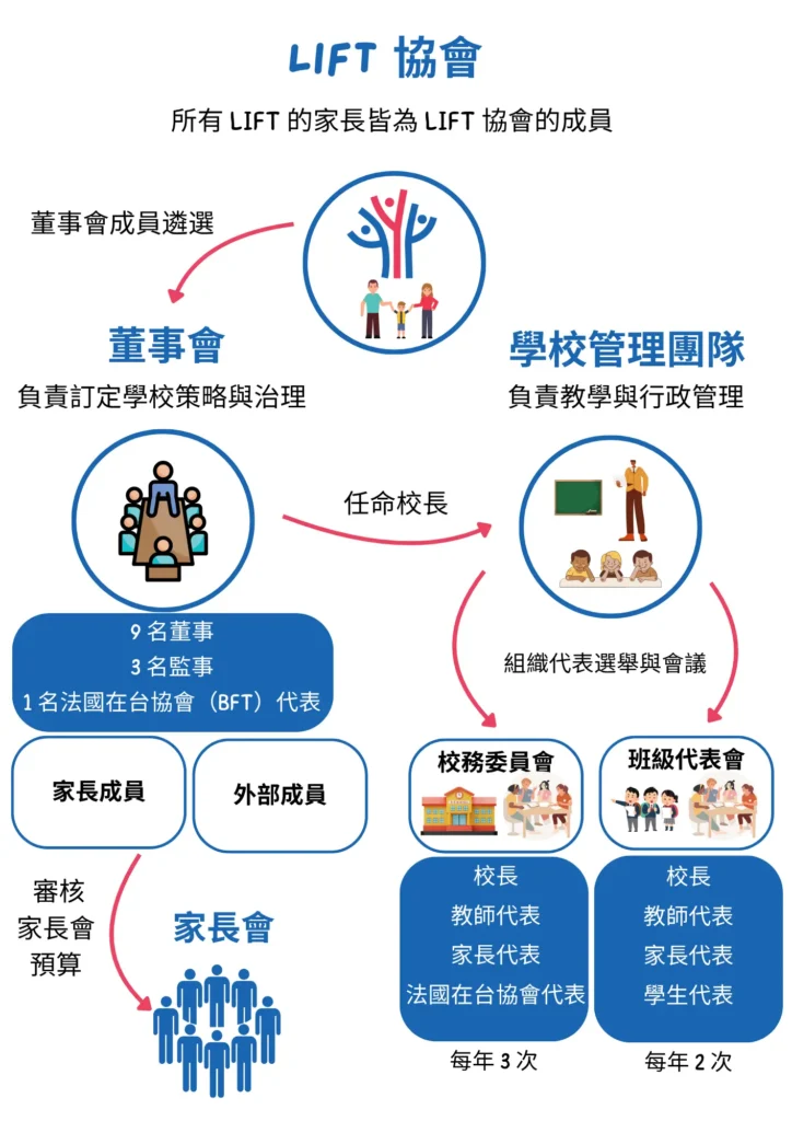LIFT 是一所非營利組織,服務台北的法籍及法語人士社群。LIFT 不依賴任何私人投資,也不向股東分紅。其資本與營運支出完全由自身收入支應,若有盈餘,將全數再投入於學校的發展。